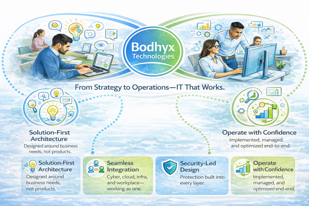Bodhyx Technologies is a next-generation enterprise system integrator and managed services provider based in India. We help organizations design, secure, and operate mission-critical IT environments across cybersecurity, cloud, data center, connectivity, and digital workplace domains.